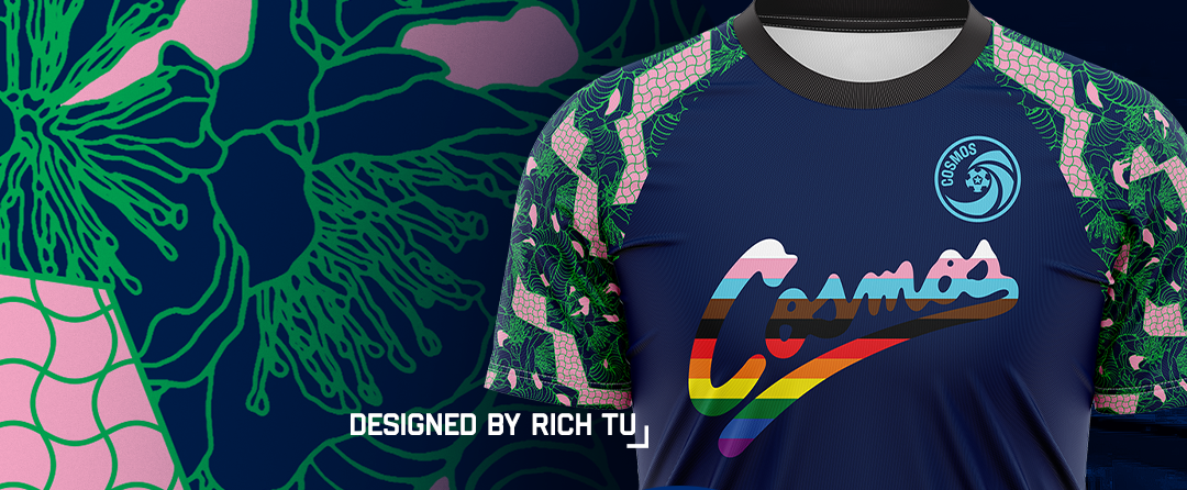 The design features vibrant color work and a striking sleeve pattern, paired with a reinterpreted Cosmos wordmark. Every element reflects a commitment to inclusion and the importance of showing up as your full self — on and off the pitch.