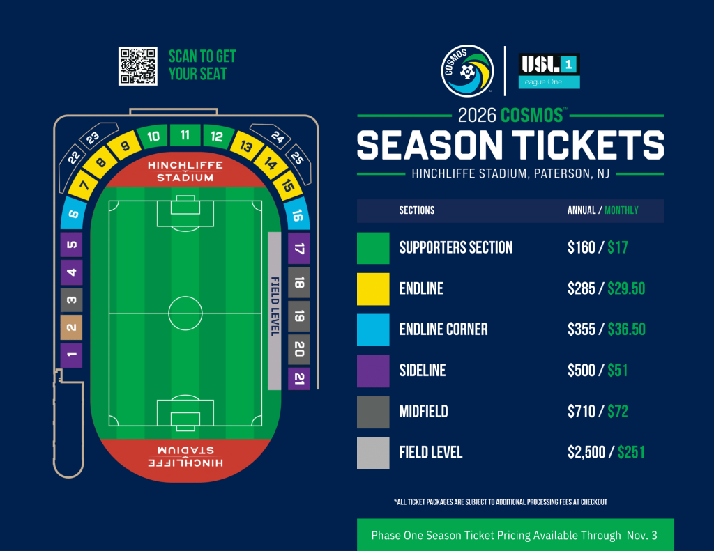 The New York Cosmos will return in 2026 for our first season in USL League One, playing at Hinchliffe Stadium in Paterson, NJ — a National Historic Landmark recently reopened after a $110 million renovation.