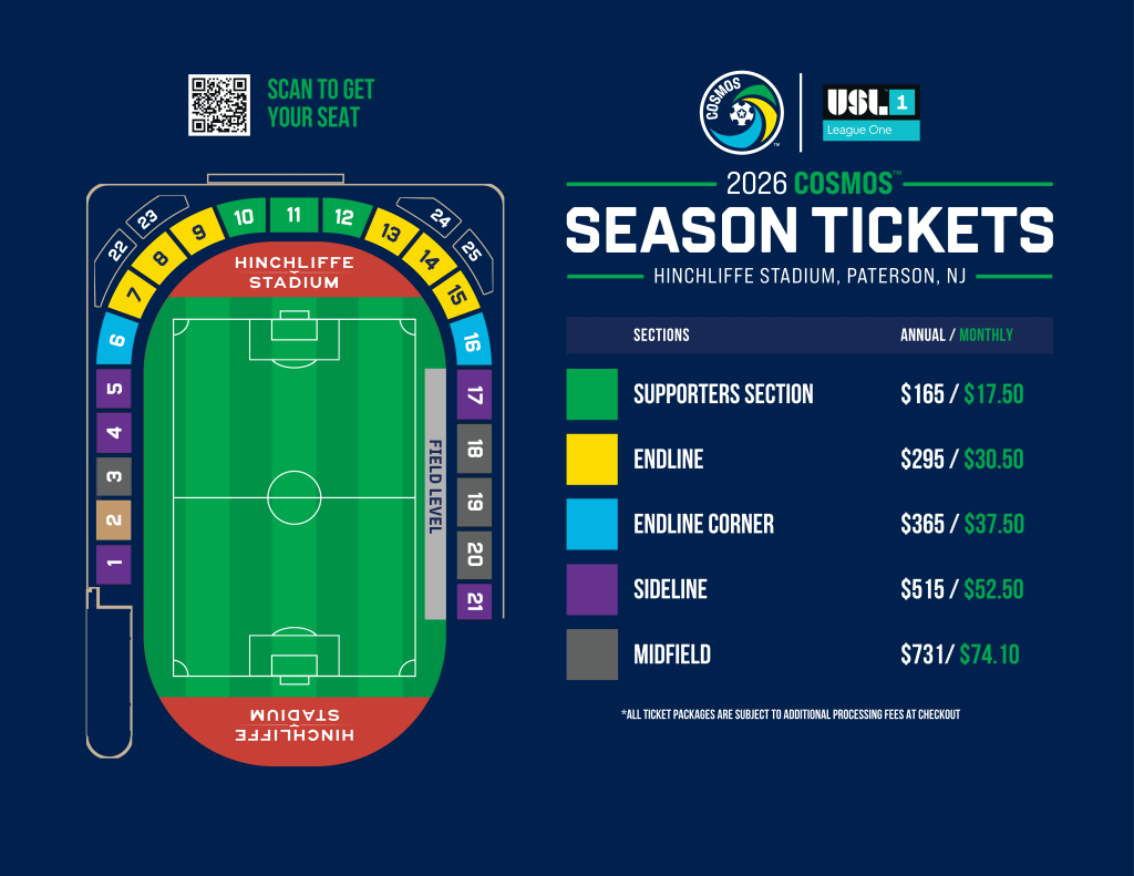 A full season ticket is not just access to matches. It is a place in the return of the Cosmos. A seat at Hinchliffe Stadium before the first whistle of a new era. A place where you stand with your family, your friends, and your community, week after week.